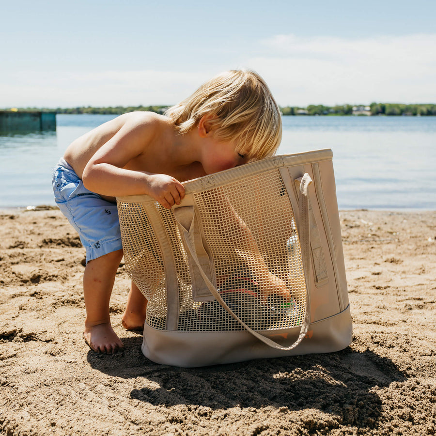 Where practicality meets impeccable design. Your trusty sidekick to life's sandy escapades. Made from tough materials (waterproof mesh and vinyl-coated nylon), this tote isn't afraid to get a little sandy or dance in the rain. Easy to clean? Absolutely! We call that practical chic. Say goodbye to flimsy beach totes; this one's your steadfast companion, built to withstand the unexpected twists of #beachlife (or just life).